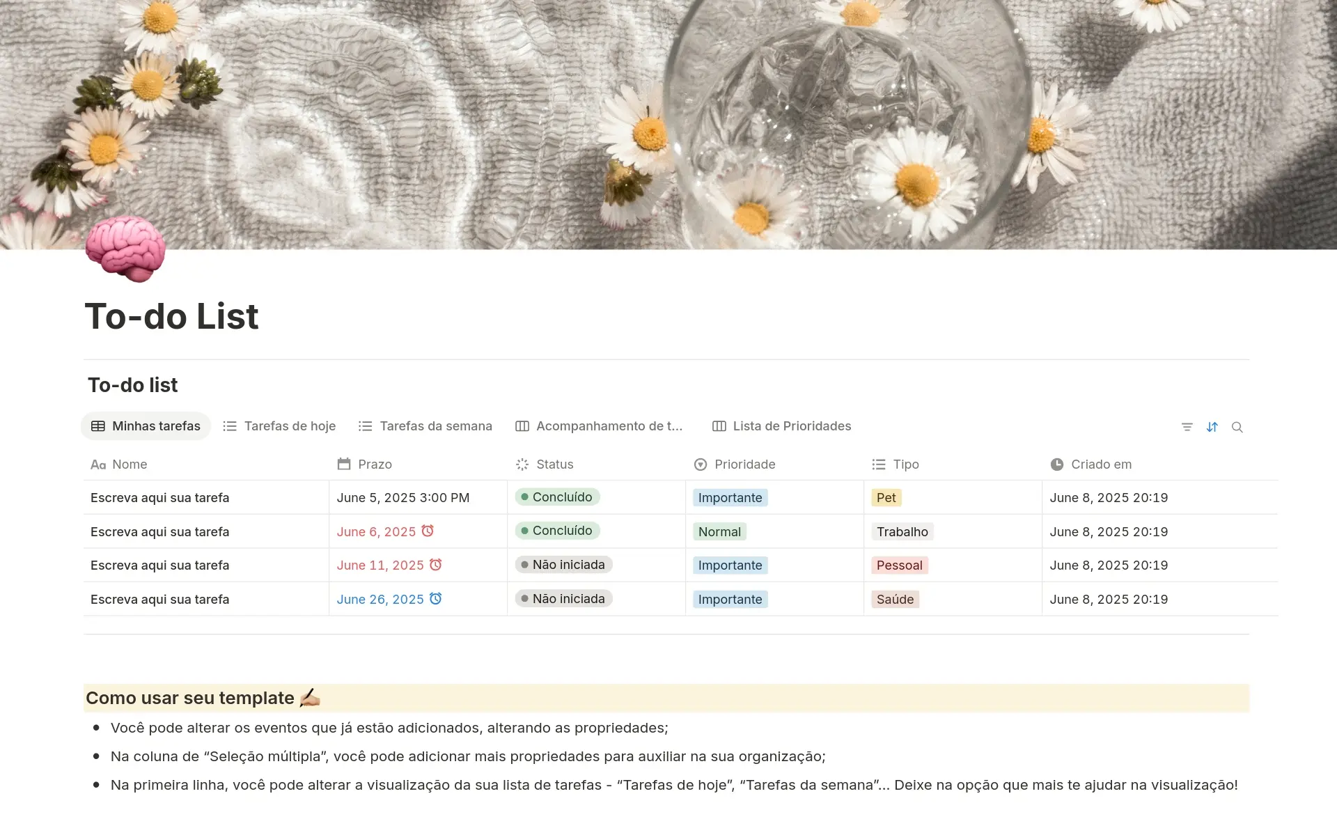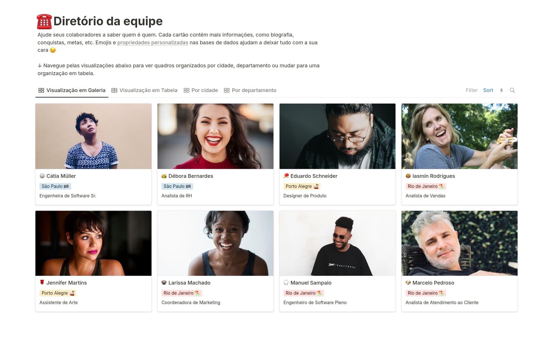 • Base de dados: Altere nomes, tipos e ícones de propriedades ou adicione/remova propriedades que não atendam às suas necessidades. Adicione novas visualizações de base de dados, como quadros, listas, calendários, cronogramas ou galerias.